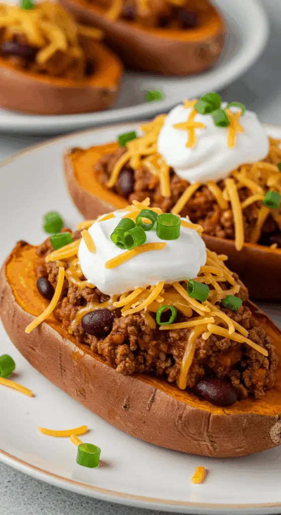 Craving a comforting, budget-friendly meal with bold flavors? Chili Cheese Stuffed Sweet Potato combines tender sweet potatoes with a quick beef chili, topped with creamy sour cream, sharp Cheddar, and fresh scallions