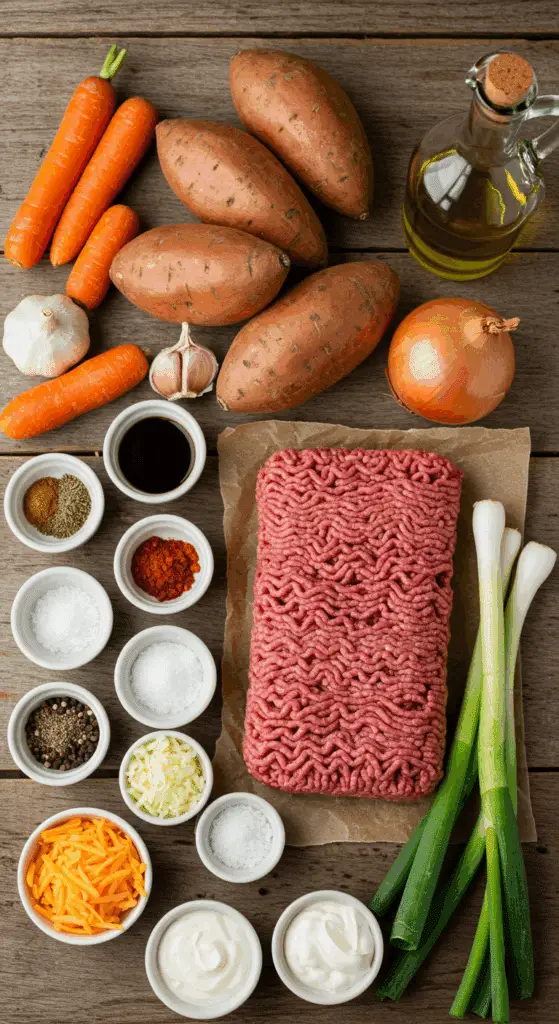 • Gather all ingredients: 4 sweet potatoes, 2 carrots, 2 cloves garlic, 1 plum tomato, ½ onion, 2 tablespoons red wine vinegar, 1 teaspoon cumin, ½ teaspoon oregano, ¼ teaspoon cayenne, 2 tablespoons olive oil, 1 pound ground beef, salt, pepper, sour cream, Cheddar, 3 scallions.