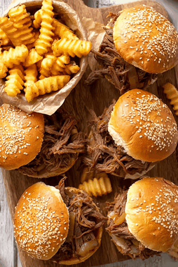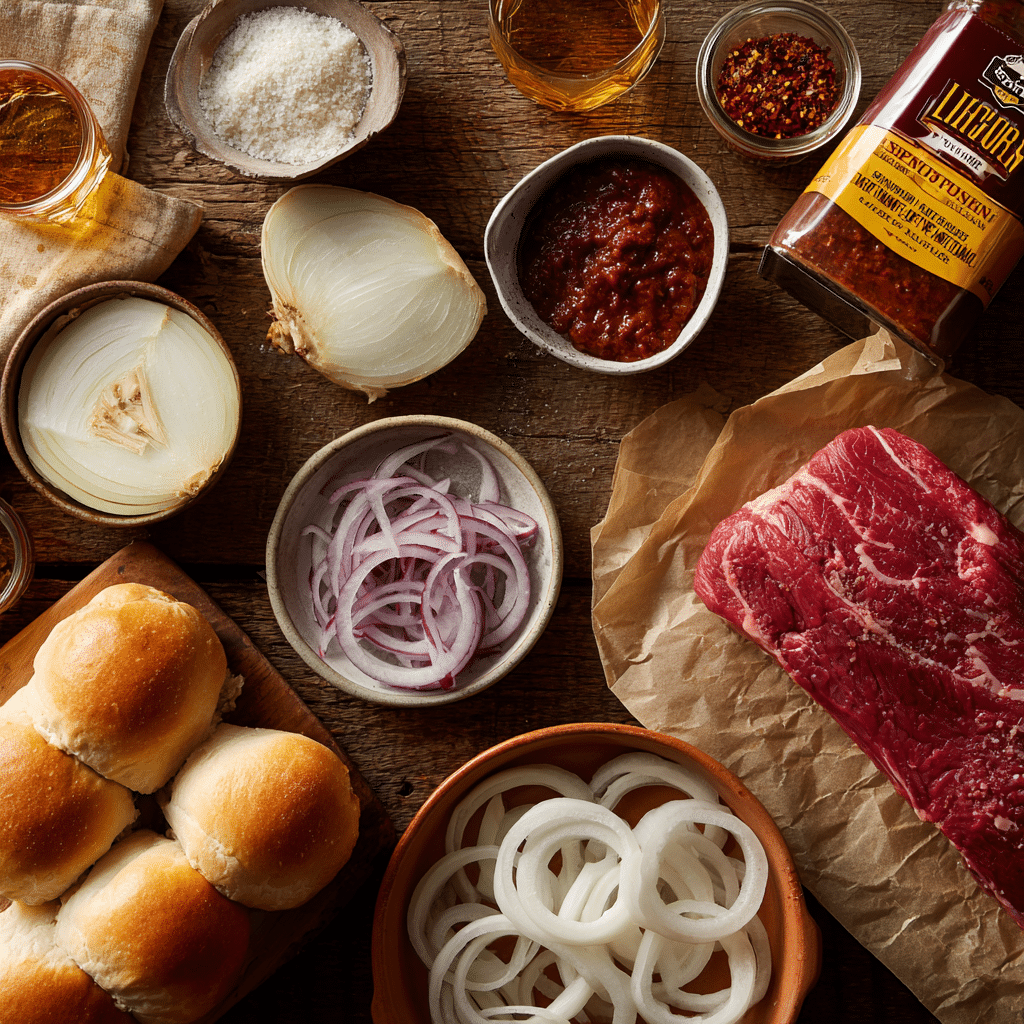 - Oven Option: Bake beef, onions, and sauce in a covered dish at 325°F for 3-4 hours, shred, and serve.