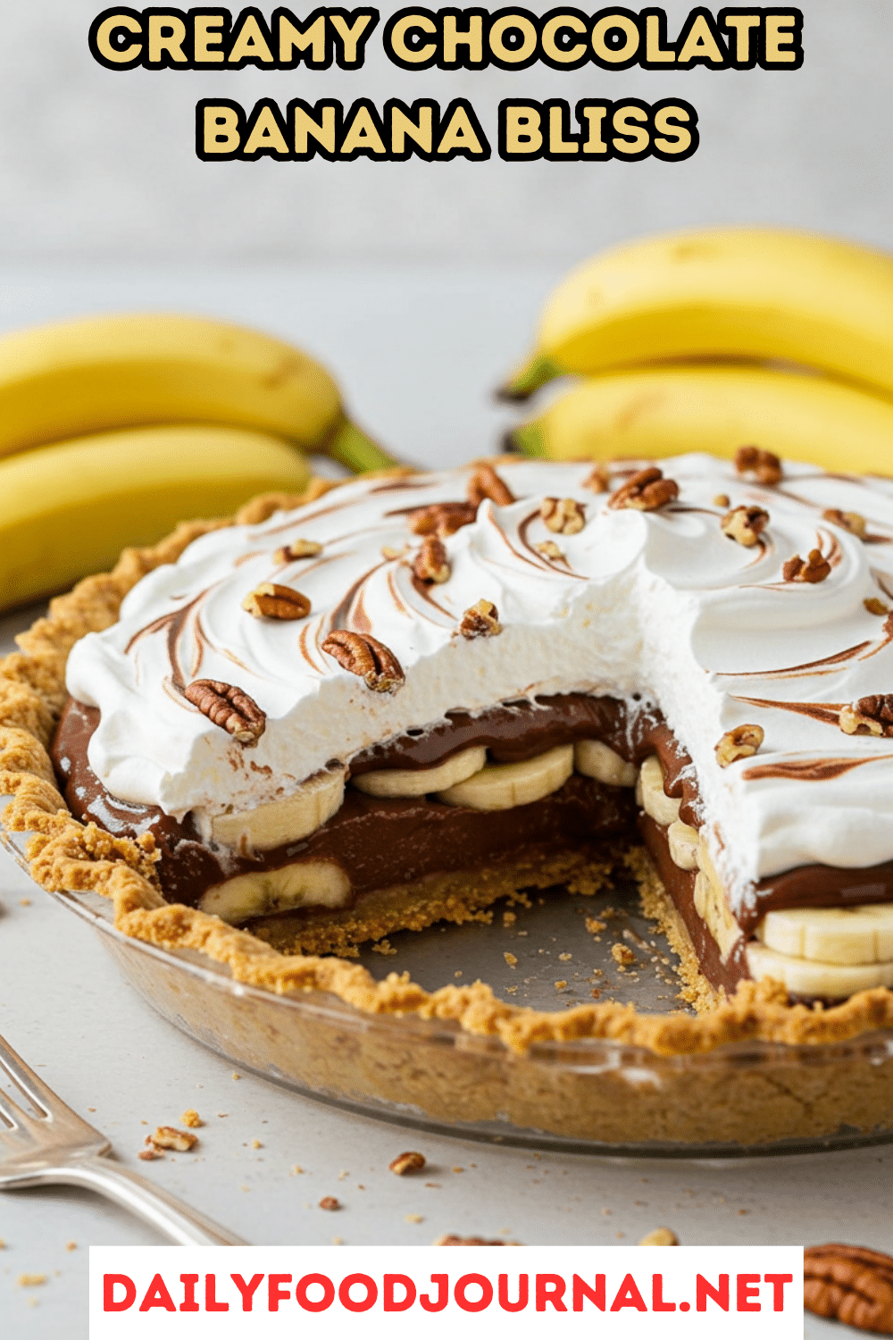 You’ve just created a Chocolate Banana Pie that’s as indulgent as it is comforting! With its pecan-studded crust, creamy cream cheese and whipped cream layers, fresh bananas, rich chocolate pudding, and crunchy pecan topping, this dessert is perfect for family gatherings, potlucks, or any time you crave a sweet, layered treat. Get creative with variations or serve it classically, and enjoy every chilled, flavorful bite. How will you make your pie unique? Share your ideas in the comments—I’d love to hear them!