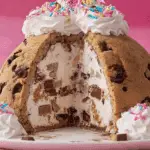 The Chocolate Chip Cookie Bombe is a next-level ice cream cake that combines a crisp, edible chocolate chip cookie bowl with layers of creamy vanilla ice cream, chocolate candy bars, and a playful peanut butter cup tower. It’s a bit more involved than a simple dessert but rewards you with a stunning presentation and decadent flavors.
