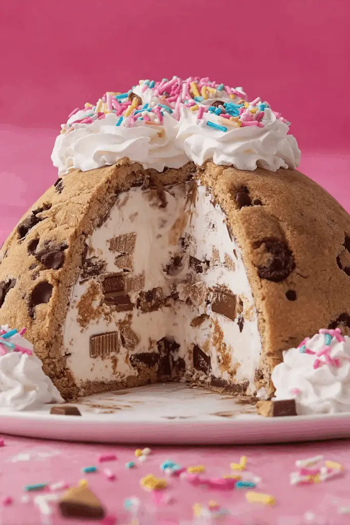 Imagine cutting into a giant chocolate chip cookie bowl filled with creamy vanilla ice cream, chunks of your favorite chocolate candy bars, and a surprise peanut butter cup tower in the center, all topped with whipped cream and sprinkles.