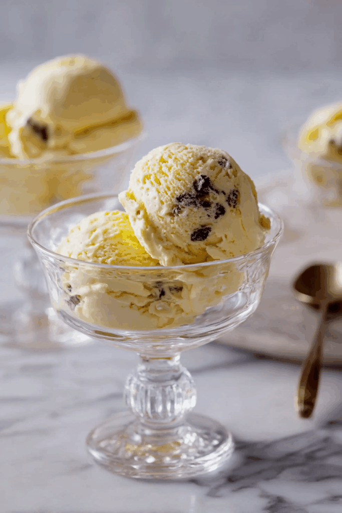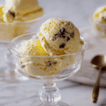 The cookie dough is the star, with butter, sugars, and chocolate chips creating soft, sweet chunks. The ice cream base uses fresh cream and half-and-half for a rich, dense texture, while the vanilla bean adds a luxurious flavor. Egg yolks make the custard thick and creamy, like eggnog. As the cook’s note highlights, whole vanilla beans (Mexican, Madagascar, Indonesian, or Tahitian) give unique flavor notes, making this ice cream stand out.