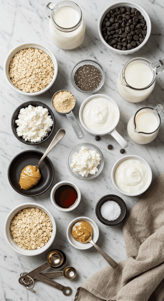 - Gather all ingredients: 1 cup rolled oats, 1 ½ tablespoons chia seeds, ¼ cup vanilla protein powder, ¼ teaspoon salt (omit for cottage cheese), ½ cup cottage cheese or Greek yogurt, 1–1 ½ cups milk, 2 tablespoons maple syrup, 1-2 tablespoons almond or cashew butter, and 1-2 tablespoons chocolate chips.