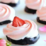 These Chocolate-Dipped Strawberry Meringue Roses are almost too pretty to eat… almost! I am absolutely captivated by their delicate rose shape, their light-as-air crispness, and the surprising burst of intense strawberry flavor packed into the meringue itself. The chocolate dip just takes them over the top!