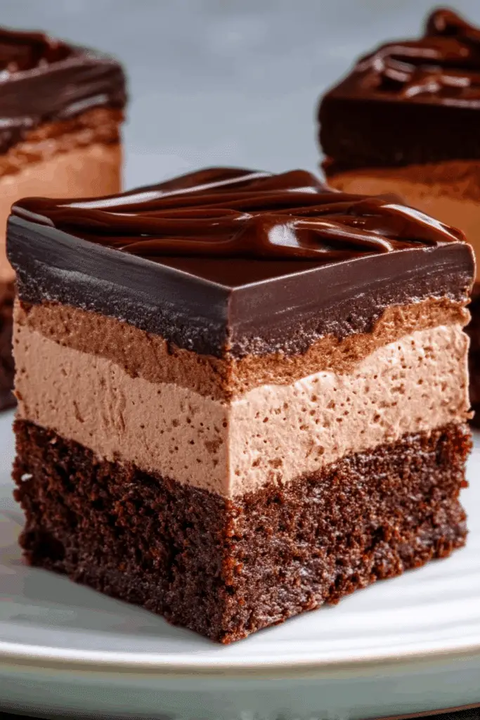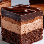 Imagine biting into a dense brownie base, topped with airy chocolate mousse, and finished off with a shiny ganache glaze. It’s the kind of layered dessert that looks bakery-fancy but is surprisingly easy to make at home.