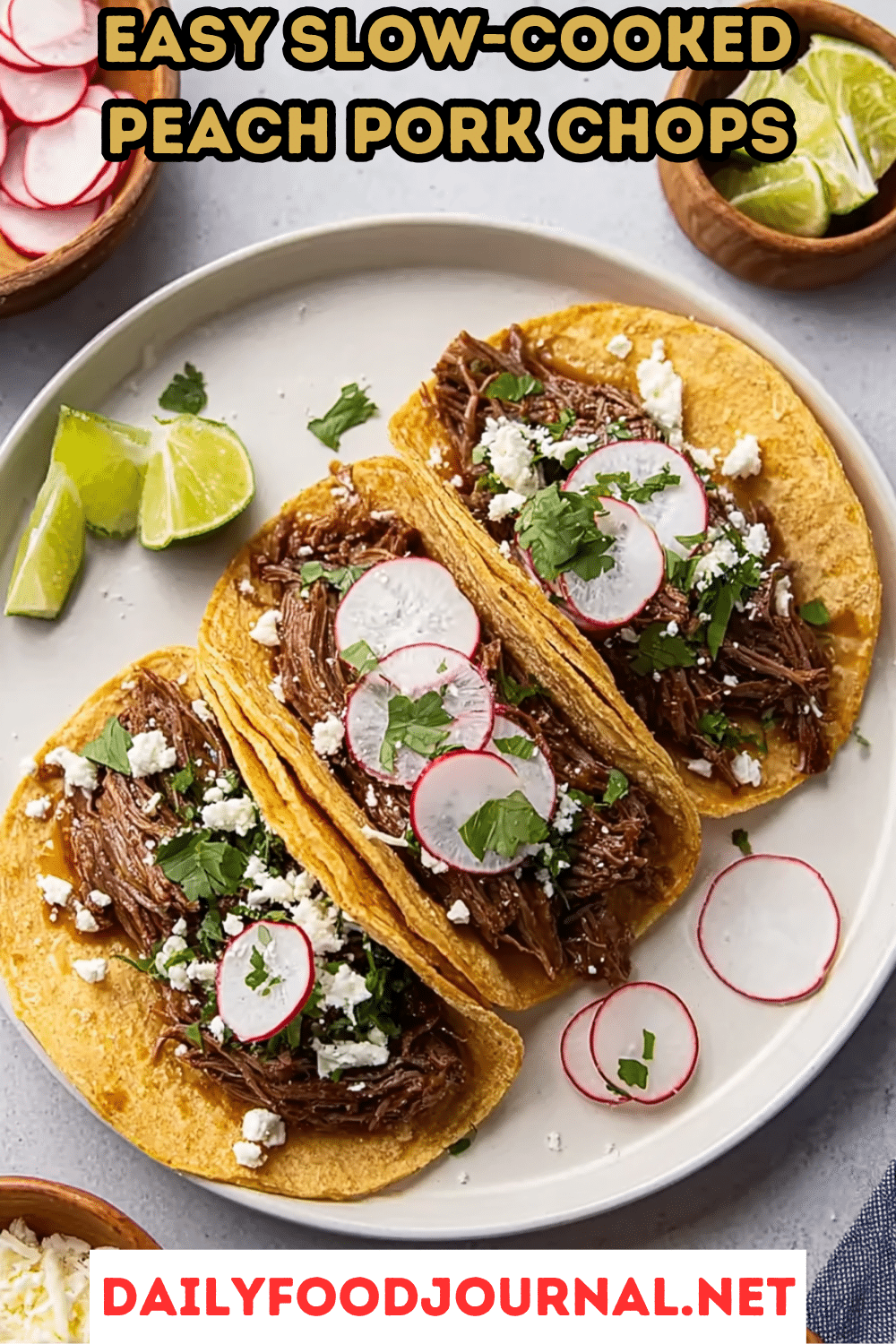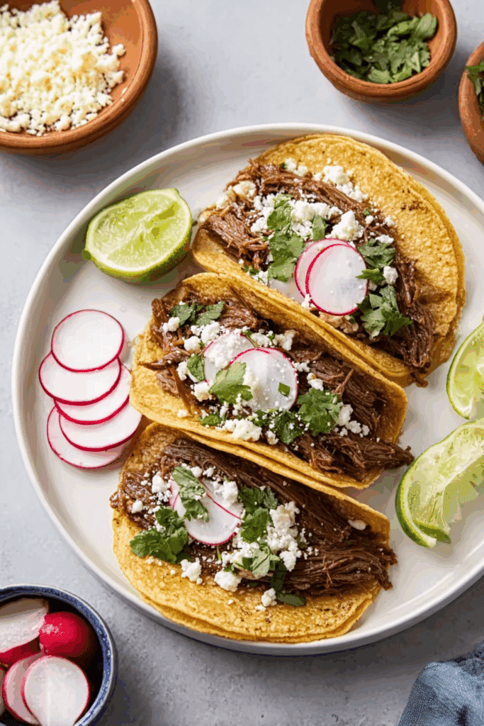 • Prep optional toppings: warm corn tortillas, crumble Cotija cheese, slice radishes, pick cilantro leaves, cut lime wedges, and set out sour cream.