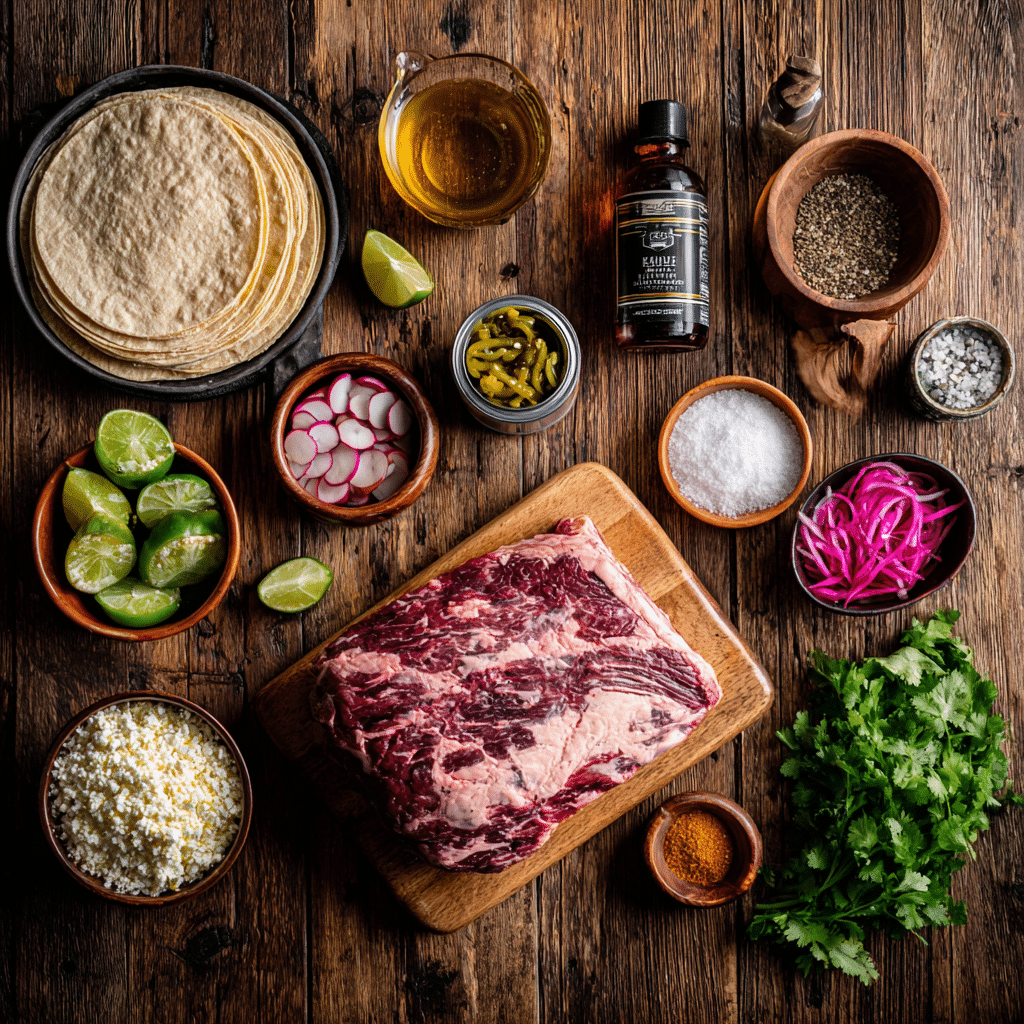 • Toppings: Tortillas, Cotija, lime, cilantro, radishes, and sour cream create a fresh, creamy, and zesty taco experience.