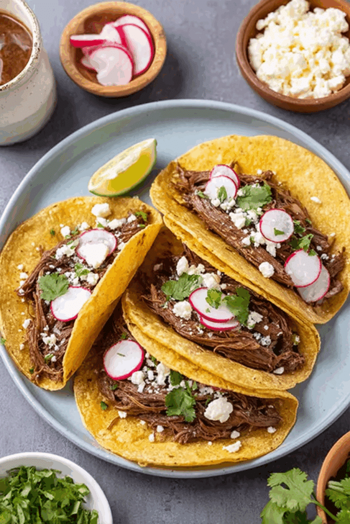 - Build Tacos: Pile beef onto tortillas and top with Cotija, cilantro, radishes, and lime for a vibrant taco.