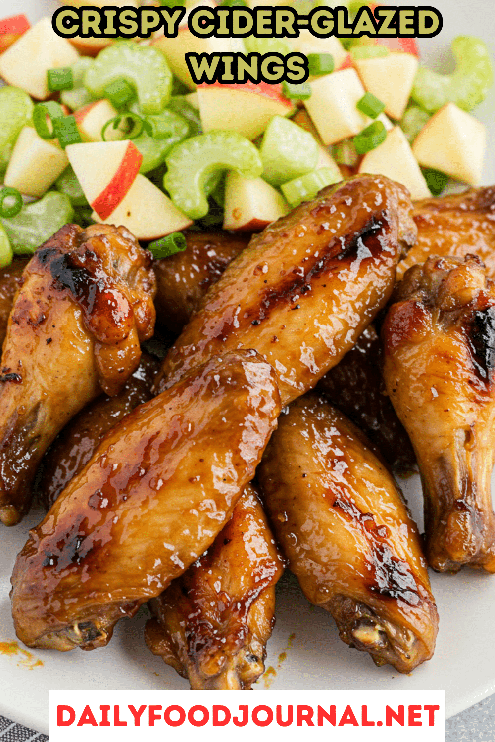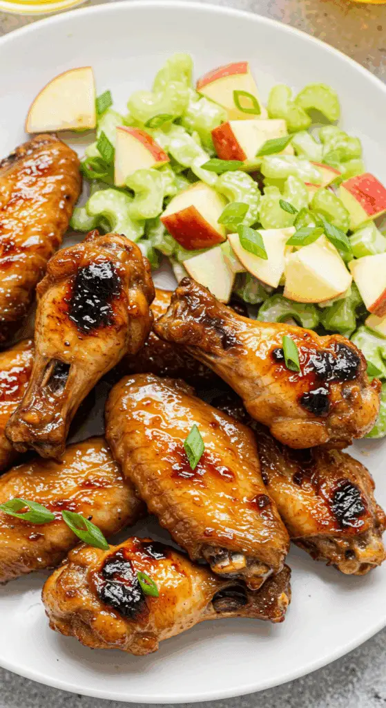 - Make-ahead: Season wings a day ahead and refrigerate. Make glaze ahead and warm gently before using. For salad, chop celery and scallions early, but slice apples just before serving.