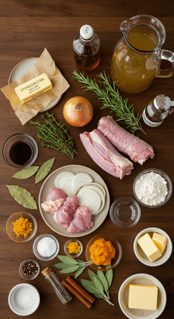 - Gather all ingredients: 2 tablespoons butter, 1 medium onion (or leek/shallots), turkey neck and giblets (no liver), 8 cups chicken broth, 3 herb sprigs, 1 bay leaf, turkey drippings, ½ cup flour, Worcestershire sauce, salt, pepper, and optional flavored butter.