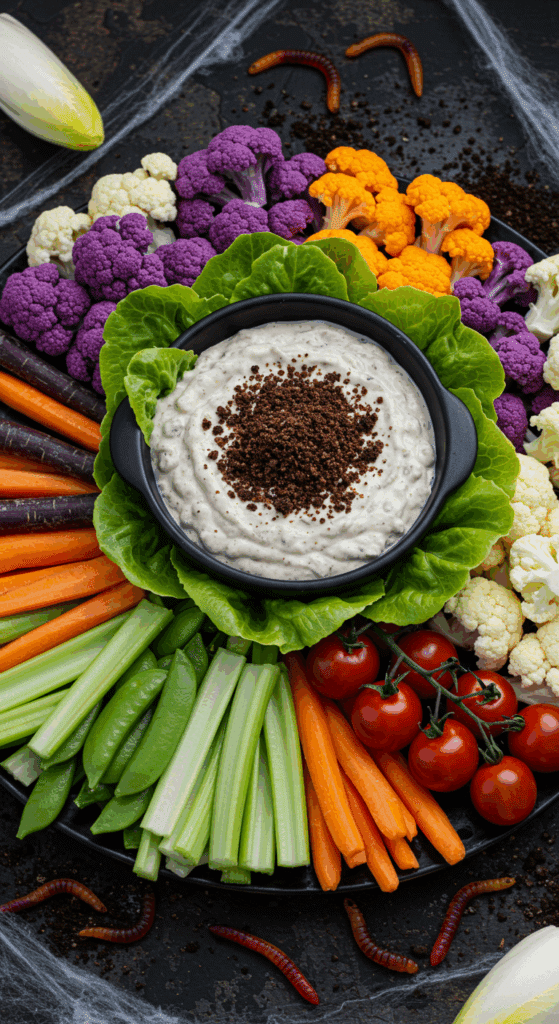 Have you ever wondered if a plate of veggies could look like a spooky compost pile but taste like a creamy, delicious snack? Picture a bowl of rich, green dip sprinkled with dark “dirt” crumbs, surrounded by colorful veggies that look like they’re growing from a garden graveyard.