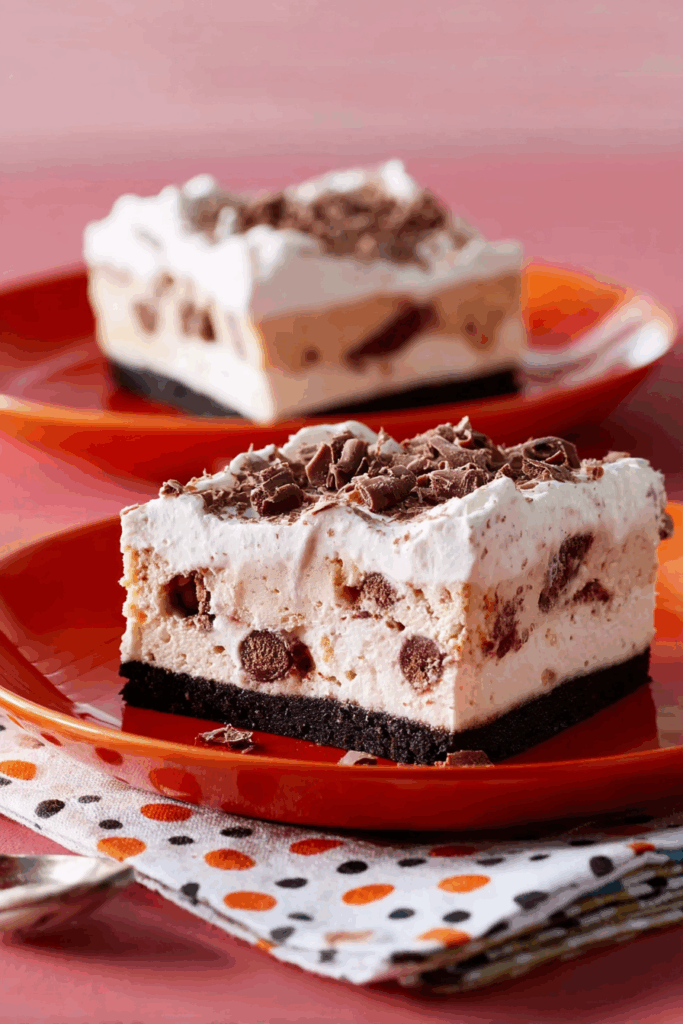Picture slicing into a chilled, creamy bar with a crunchy cookies-and-cream crust, layered with cookie dough ice cream, a drizzle of gooey caramel, and a fluffy whipped topping, all sprinkled with delicate shavings of semi-sweet chocolate.