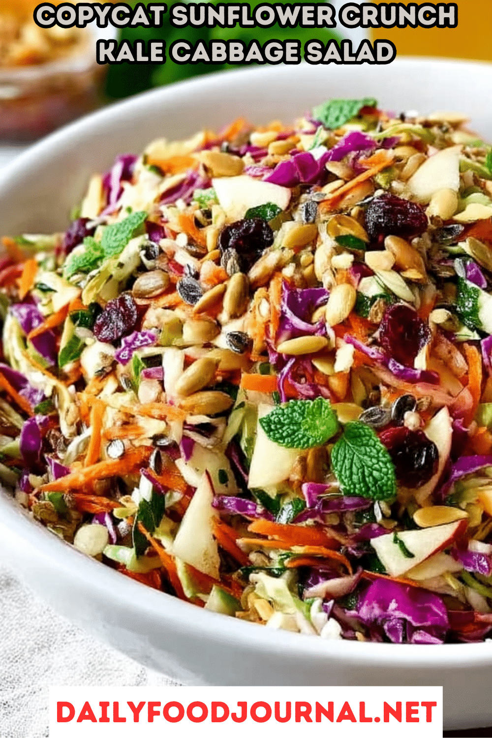 Make this Copycat Sunflower Crunch Kale Cabbage Salad! Crunchy cabbage, kale, bacon bits, sunflower seeds, and a creamy cider dressing make it an irresistible, hearty salad.