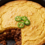 Difficulty level: Easy! If you can brown meat and whisk batter, you’re set. A 3.5–4-quart ovenproof skillet (like a 12-inch cast iron), a knife, and a whisk are the main tools, and kids can help stir the cornbread or add toppings.