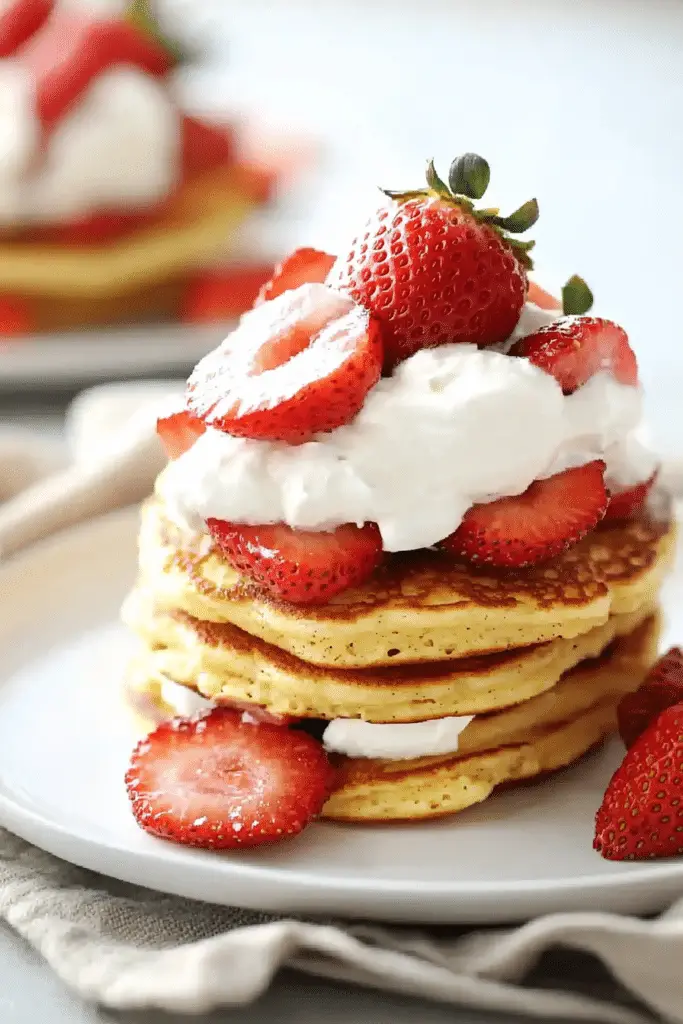 Layer each pancake generously with the prepared macerated strawberries and the chilled whipped cream. Build your tower!