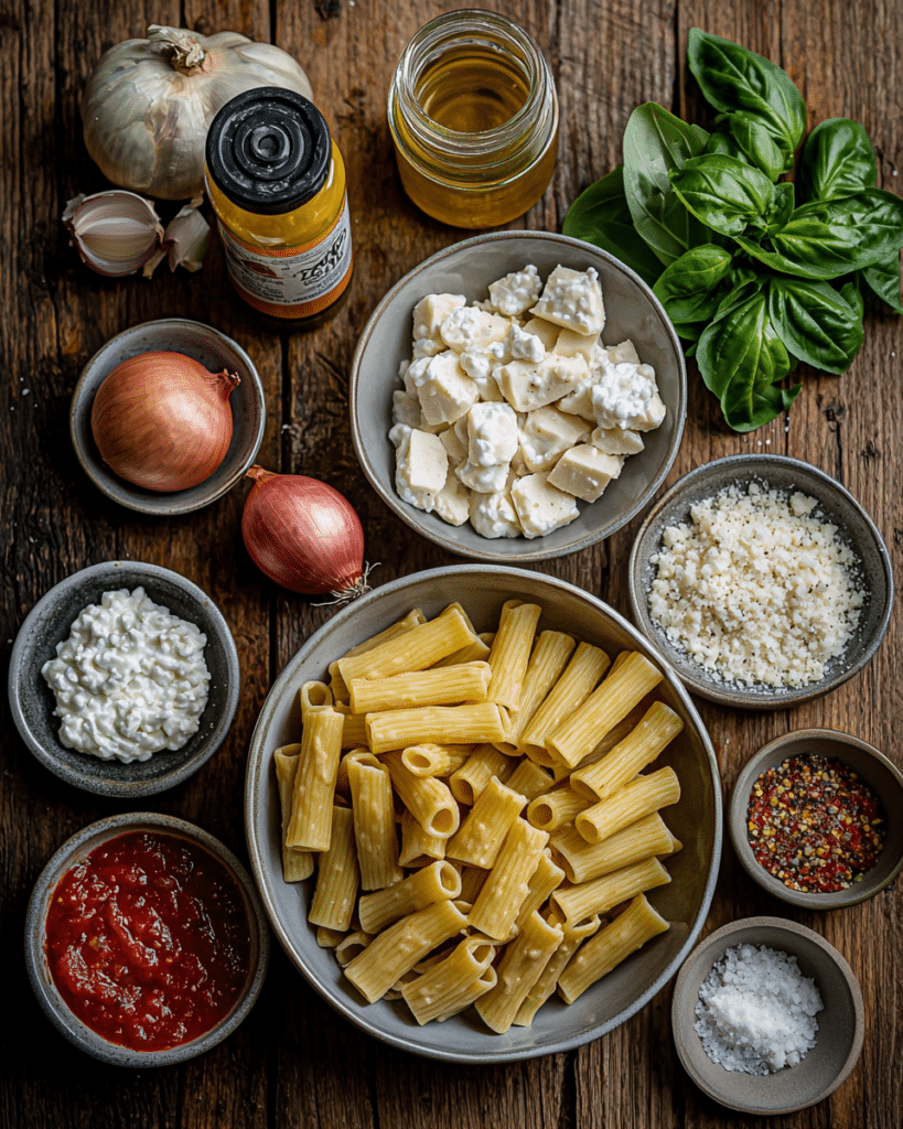 Rigatoni is perfect for this dish because its ridges catch all the creamy sauce beautifully. Olive oil gives the base a rich, smooth flavor and helps sauté the onions perfectly. Yellow onion adds sweetness and depth to the sauce without overpowering the dish. Fresh minced garlic brings aromatic intensity, enhancing every other flavor. Ground chicken is a lighter, leaner protein that soaks up the seasoning beautifully. Italian seasoning and red pepper flakes add warmth, herbs, and just a tiny kick of spice. Marinara sauce provides a rich, tomatoey backbone that blends smoothly with the cottage cheese. Cottage cheese adds creaminess and extra protein while keeping the sauce light and fresh. Parmesan cheese and fresh basil brighten up the final dish and add a burst of classic Italian flavor.