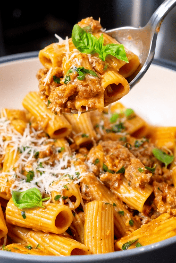 Swap rigatoni for penne, ziti, or even fusilli depending on what you have on hand. Use ground turkey or even lean ground beef for a different protein option. Add sautéed spinach, zucchini, or mushrooms for extra veggies and nutrition. Top with shredded mozzarella and broil for a couple of minutes for a baked pasta twist.