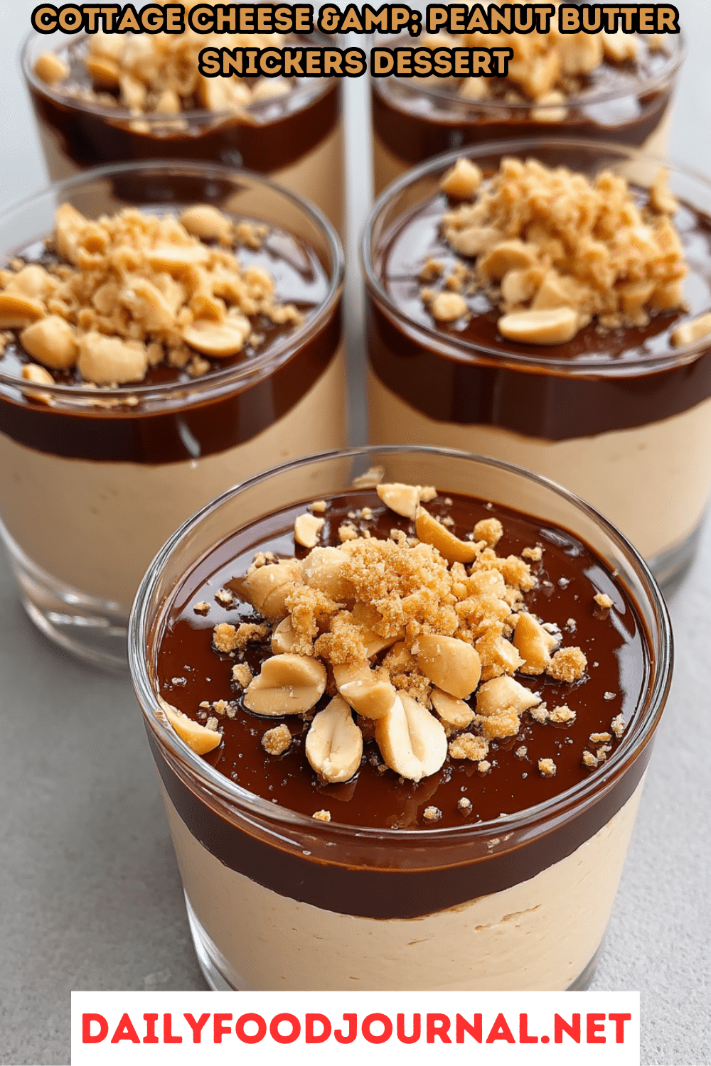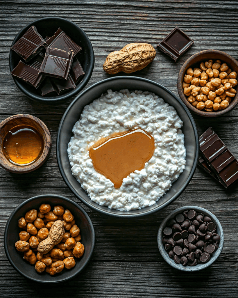 Cottage cheese is the star—it blends into a smooth, thick texture that mimics cheesecake filling while delivering a solid dose of protein. Peanut butter adds richness and flavor—go for unsalted and creamy to keep the base silky. Honey or maple syrup sweetens everything naturally, balancing the tang of the cottage cheese. Melted chocolate gives that signature Snickers-like layer, while chopped peanuts bring texture and crunch. It’s a five-ingredient dessert that truly feels like more.