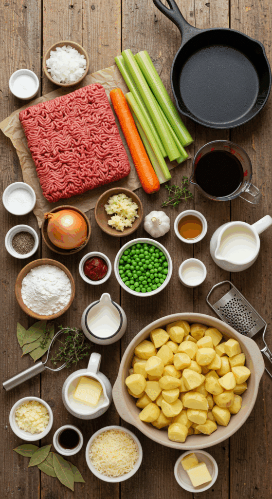 Cottage Pie uses pantry staples for a hearty, flavorful result. Here’s what you’ll need for 6-8 servings: