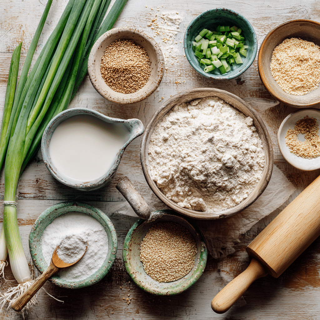 • Health Benefit: Low-gluten flour and corn oil make these lighter; green onions and sesame seeds add vitamins and healthy fats, but enjoy in moderation due to sodium!