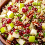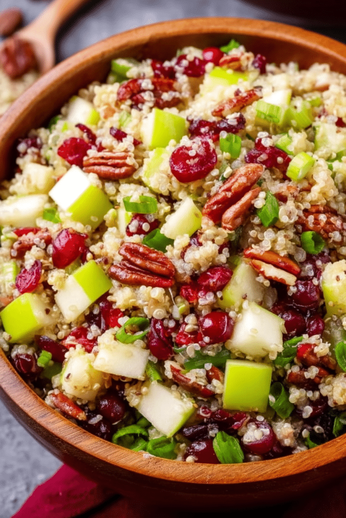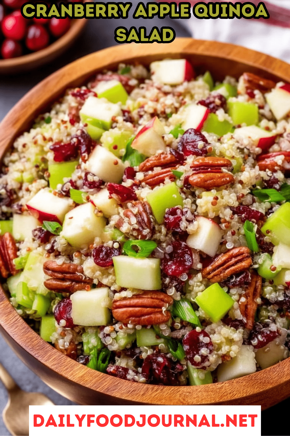 Make this Cranberry Apple Quinoa Salad! Fluffy quinoa, crisp apples, crunchy pecans, and a tangy vinaigrette create the perfect fresh, nourishing dish for any meal.
