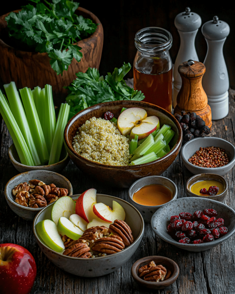 It’s light, colorful, and packed with texture—from fluffy quinoa to crunchy celery and pecans, and juicy bursts of apple and cranberry.
