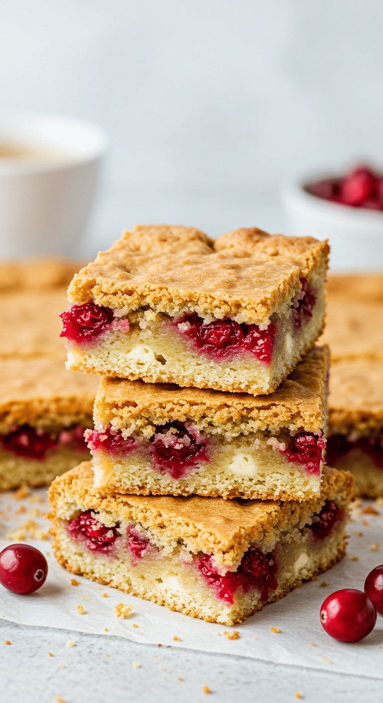 - Cool and serve: Cool on a wire rack for 15-20 minutes. Cut into 20 squares (4×5 grid). Serve with optional whipped cream and a fresh cranberry per piece. Tip: Serve warm for a cozy feel or at room temperature for clean cuts.