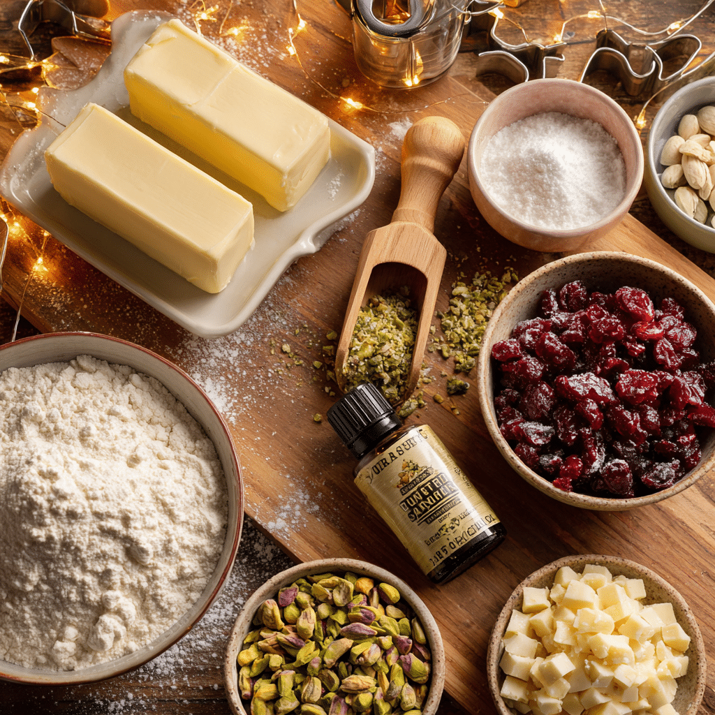 Cranberry Pistachio Shortbread Cookies use pantry staples and festive add-ins for a perfect balance of flavors. Here’s what you need and why each one matters: