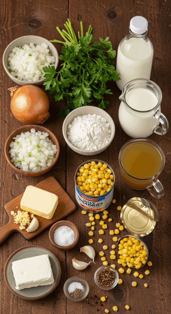 Creamy Corn Soup uses pantry staples for a rich, flavorful result. Here’s what you’ll need for 4 servings: