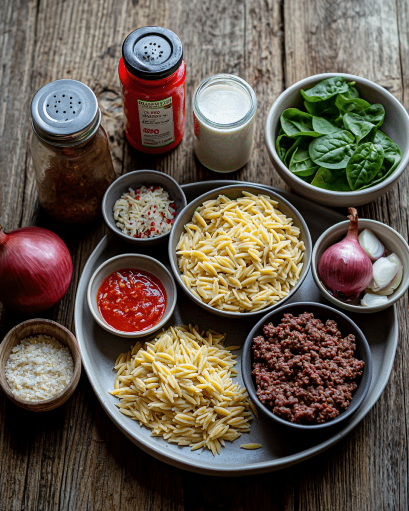 Lean ground beef forms the hearty base of the dish, keeping it rich without being greasy. Yellow onion adds sweetness and depth as it caramelizes alongside the beef. Fresh minced garlic infuses the entire pot with a warm, savory aroma that’s irresistible. Italian seasoning and dried basil create a herby backbone, while crushed red pepper flakes add a subtle kick. Tomato paste and tomato sauce build a rich, slightly tangy flavor that pairs perfectly with the beef. Orzo, a tiny rice-shaped pasta, cooks right in the sauce, soaking up all the delicious flavors. Beef broth deepens the savory notes and keeps the orzo moist and tender. Heavy cream adds a luscious, silky richness that ties everything together. Worcestershire sauce boosts the umami flavors, making the dish even more satisfying. Fresh spinach adds a burst of color and lightness, balancing the creamy sauce beautifully. Grated Parmesan gives a final salty, nutty layer of flavor that melts into the sauce perfectly.