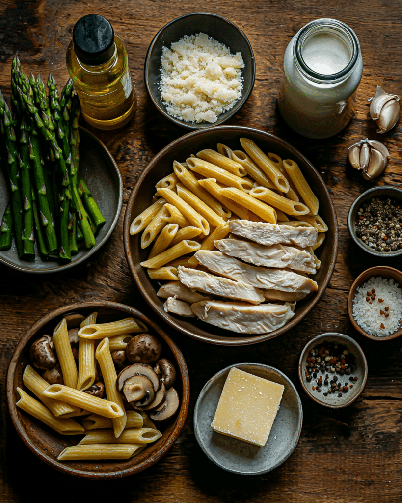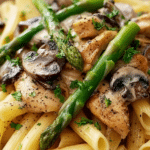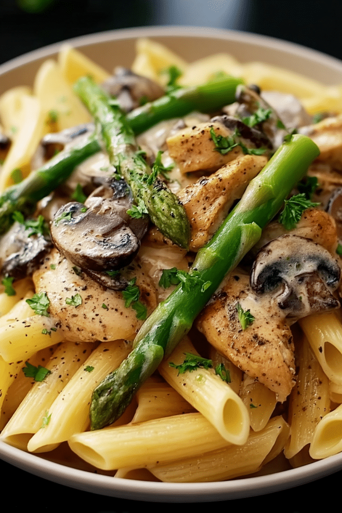 There’s something so comforting about a creamy pasta dish, especially when it’s loaded with tender chicken, earthy mushrooms, and fresh asparagus.