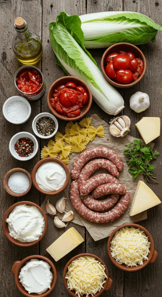 Creamy Sausage and Escarole Baked Pasta uses bold, accessible ingredients for a rich result. Here’s what you’ll need for 6 servings: