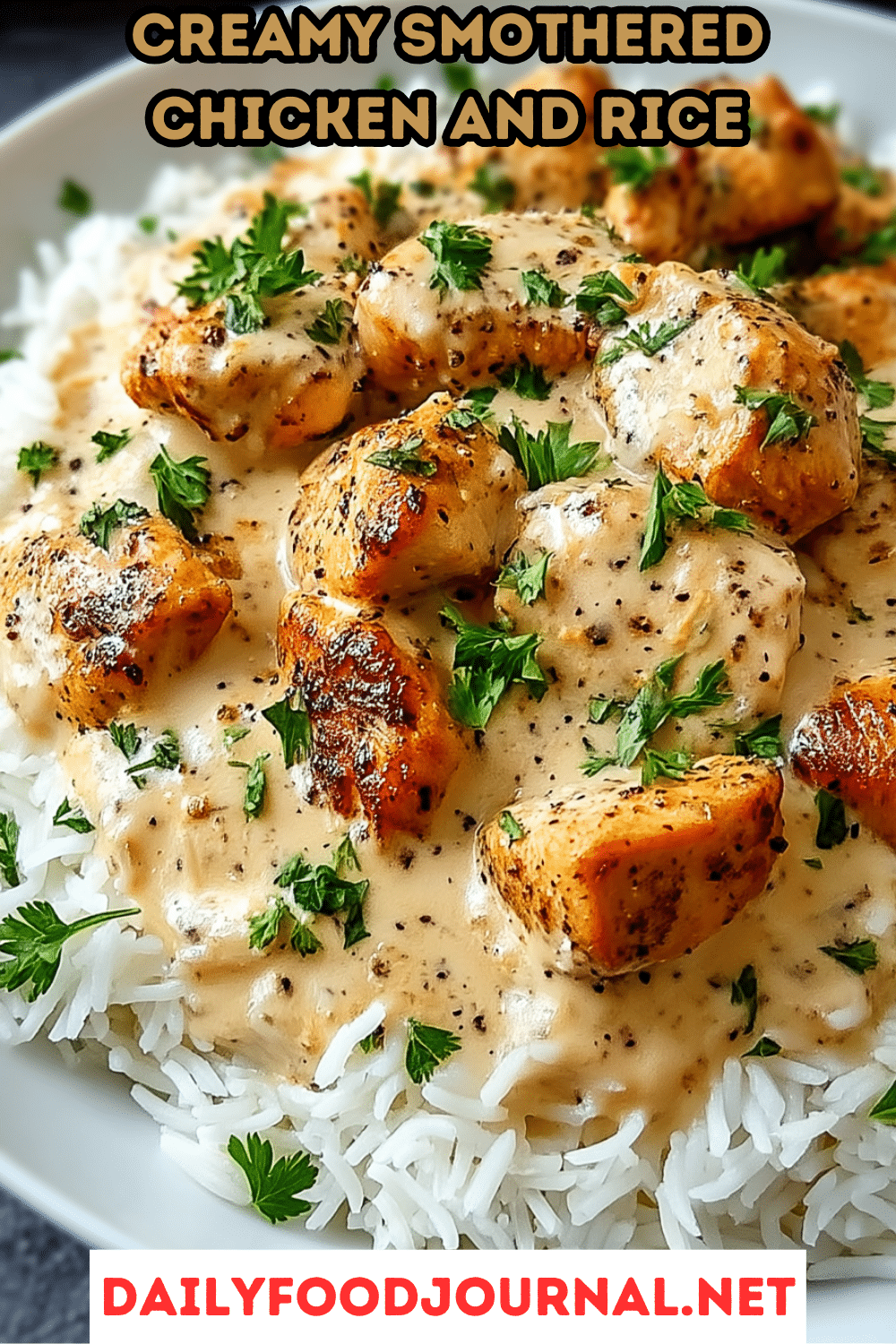 This Creamy Smothered Chicken and Rice recipe features tender chicken breasts, fluffy rice, and a rich, cheesy homemade sauce. One-pan comfort food made easy.