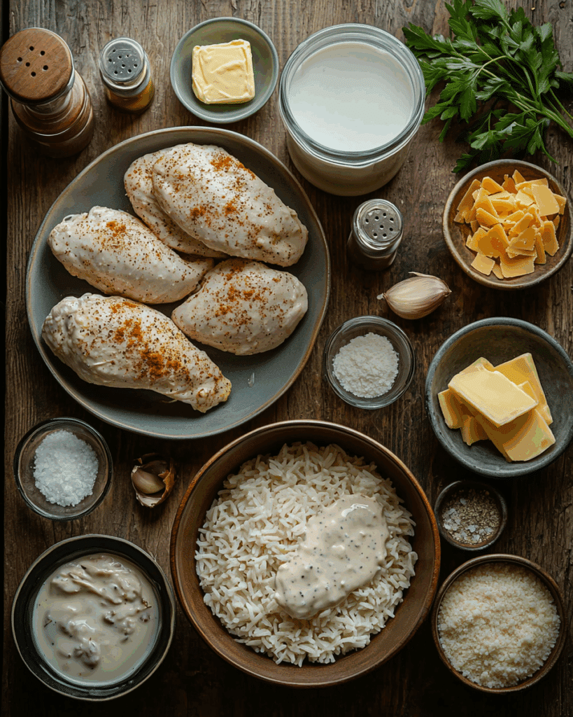 Boneless, skinless chicken breasts are lean and easy to cook, making them perfect for this kind of skillet meal. Garlic powder, onion powder, smoked paprika, and black pepper form the base seasoning—it’s flavorful but family-friendly. The rice is long-grain white rice, which stays fluffy and separate when cooked. For the sauce, you’ll need butter, flour, whole milk, and chicken broth to create that creamy, velvety base. Shredded cheddar brings melty richness, while Parmesan adds a salty depth that makes the whole dish shine. A final sprinkle of chopped parsley adds color and freshness.