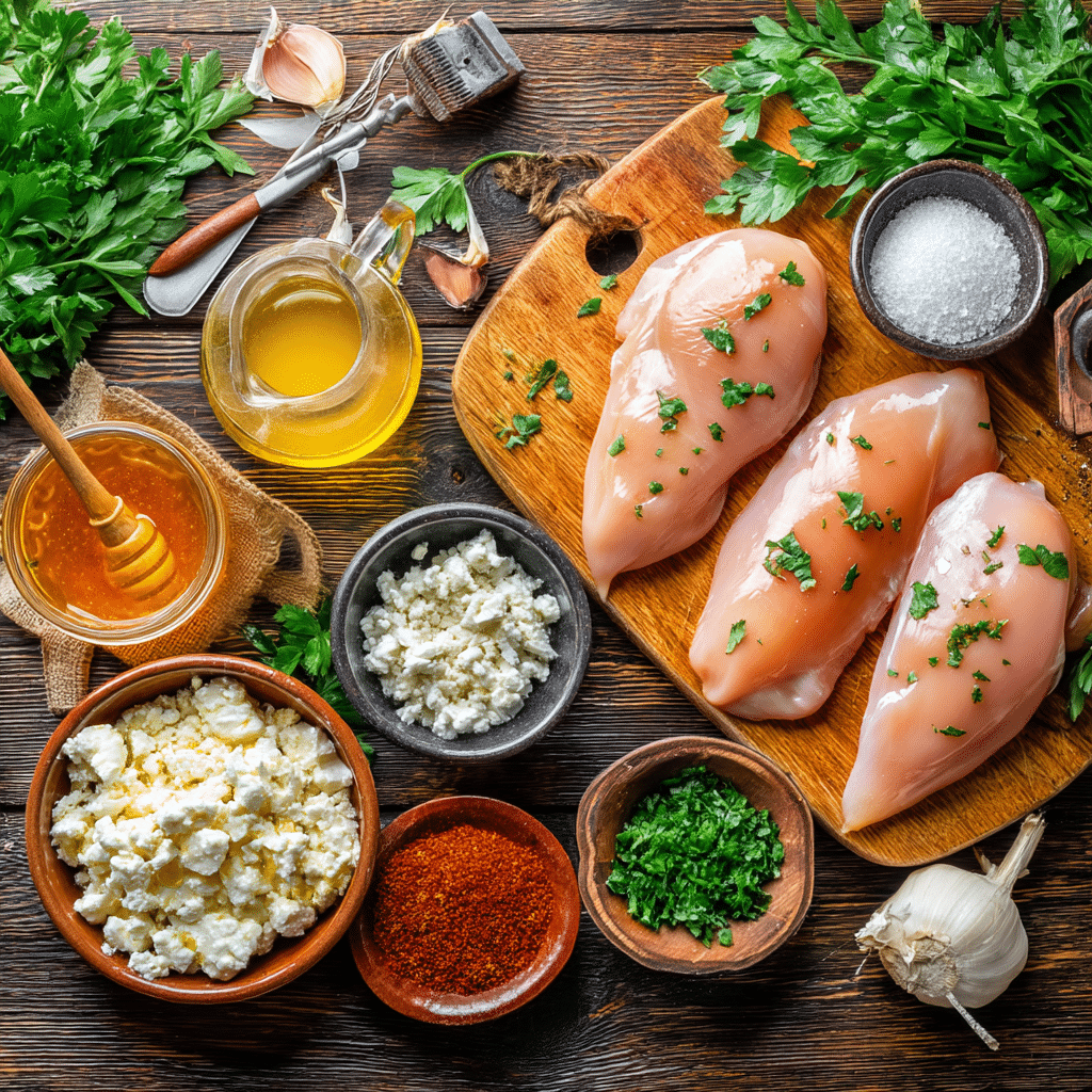 Why They’re Important: The chicken breasts provide a lean, protein-packed base, while garlic powder and paprika add savory depth. Hot honey brings the signature spicy-sweet kick, and feta cheese delivers creamy tanginess. Parsley elevates the dish with a fresh, polished finish.