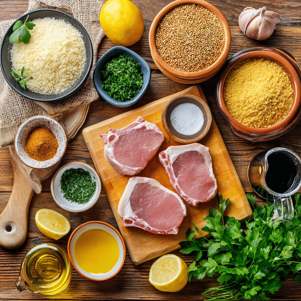 Why They’re Important: Pork chops provide a tender, protein-packed base, while the Parmesan-panko crust delivers the crispy, cheesy texture. Garlic, onion powder, and oregano add savory depth, and the egg wash ensures the crust adheres perfectly. Parsley and lemon wedges elevate the dish with a fresh, polished finish.