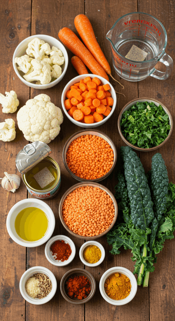 - Gather all ingredients: 2 teaspoons olive oil, 1 head cauliflower, 2 carrots, 2 cups boiling water, 1 vegetable bouillon cube, 1 can reduced-fat coconut milk, 1 cup red lentils, 1 teaspoon each garlic powder, onion flakes, curry powder, paprika, turmeric, ½ teaspoon cumin, 1 bunch kale.