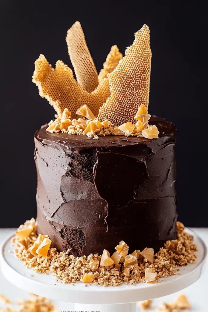Summary: This recipe features three layers of moist dark chocolate cake, filled and frosted with a rich dark chocolate fudge buttercream. The key element is homemade honeycomb candy, which is crushed and added between the layers and used as dramatic shards for decoration, providing a unique crunchy texture and caramelized flavor.