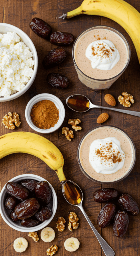 - Why It’s Special: Cottage cheese (or Greek yogurt) provides a creamy, protein-packed base, dates add natural sweetness, and a frozen banana ensures a thick, frosty texture. This recipe yields 2 servings (about 2 cups total), perfect for sharing or enjoying solo.