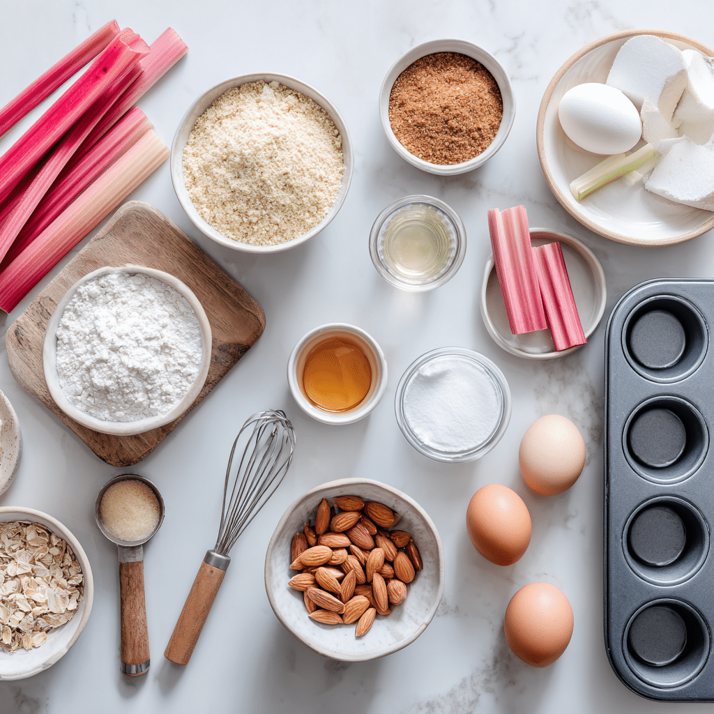These Gluten-Free Rhubarb Muffins use wholesome, gluten-free ingredients for a perfect balance of flavor and texture. Here’s what you need and why each one matters: