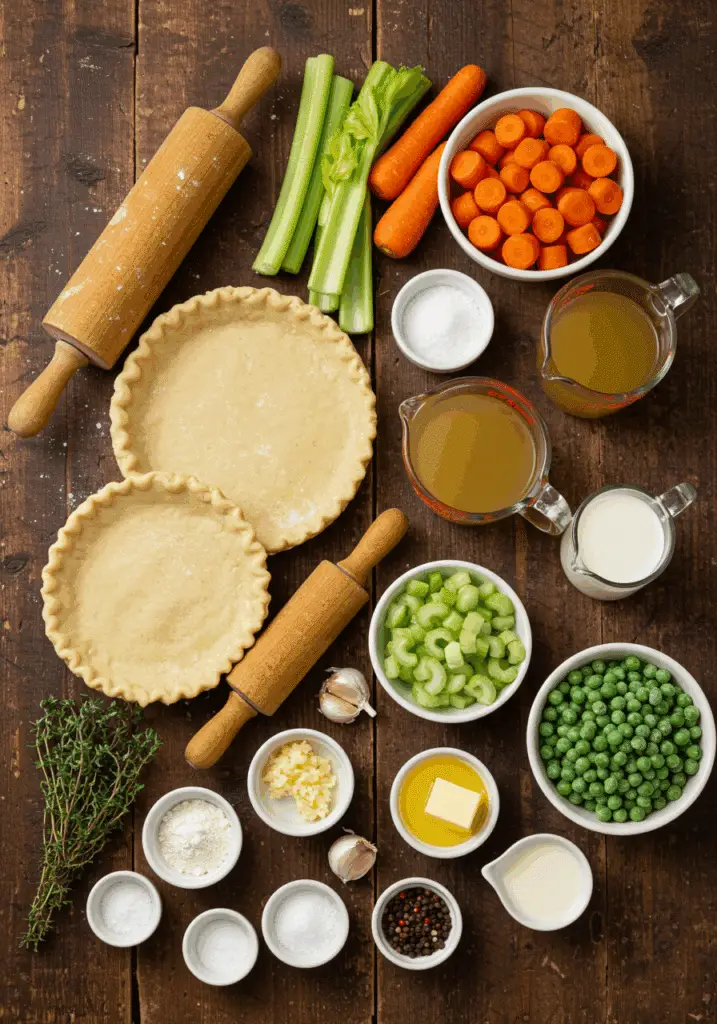 Difficulty level: Easy! If you can boil chicken, whisk a gravy, and roll dough, you’re set. A large pot, a skillet, a 9-inch pie dish, and a rolling pin are the main tools, and kids can help crimp the crust or brush the egg wash.
