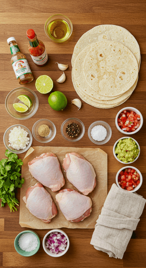 - Gather all ingredients: 4 chicken thighs, 3 garlic cloves, 1 lime (juiced, plus wedges), 1 tablespoon hot sauce, 1 teaspoon onion powder, 4 tablespoons oil, salt, pepper, 8 tortillas, minced onion, cilantro, optional toppings.