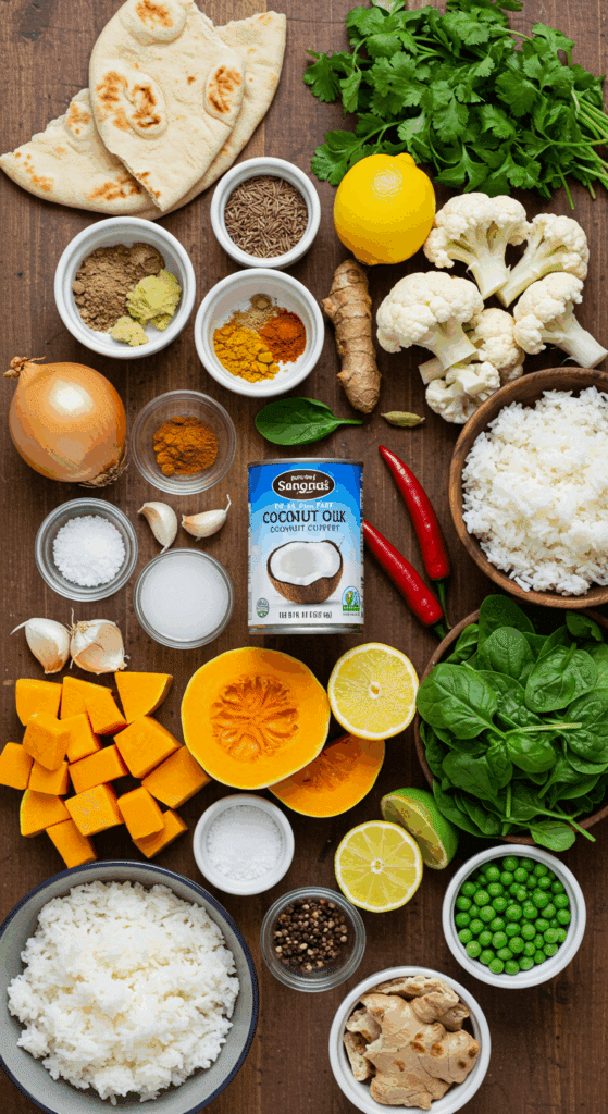 To make Easy Coconut Curry for 4 servings, you’ll need these key ingredients. Each one adds a layer of flavor or texture to this comforting dish: