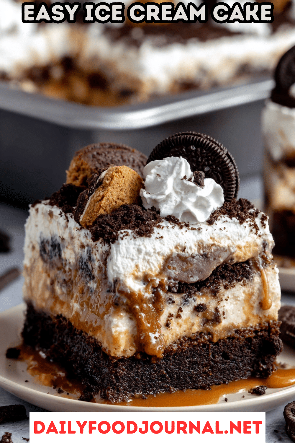 Picture slicing into a chilled, creamy ice cream cake with a fudgy brownie base, crunchy Oreos, rich hot fudge, luscious salted caramel, and a fluffy whipped cream topping, all sprinkled with Oreo crumbs and mini cookies.