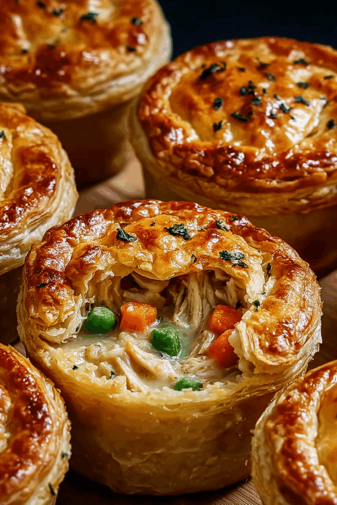Picture popping a warm, golden mini chicken pot pie into your mouth, with a flaky crust encasing a creamy filling of tender chicken, vibrant veggies, and savory herbs