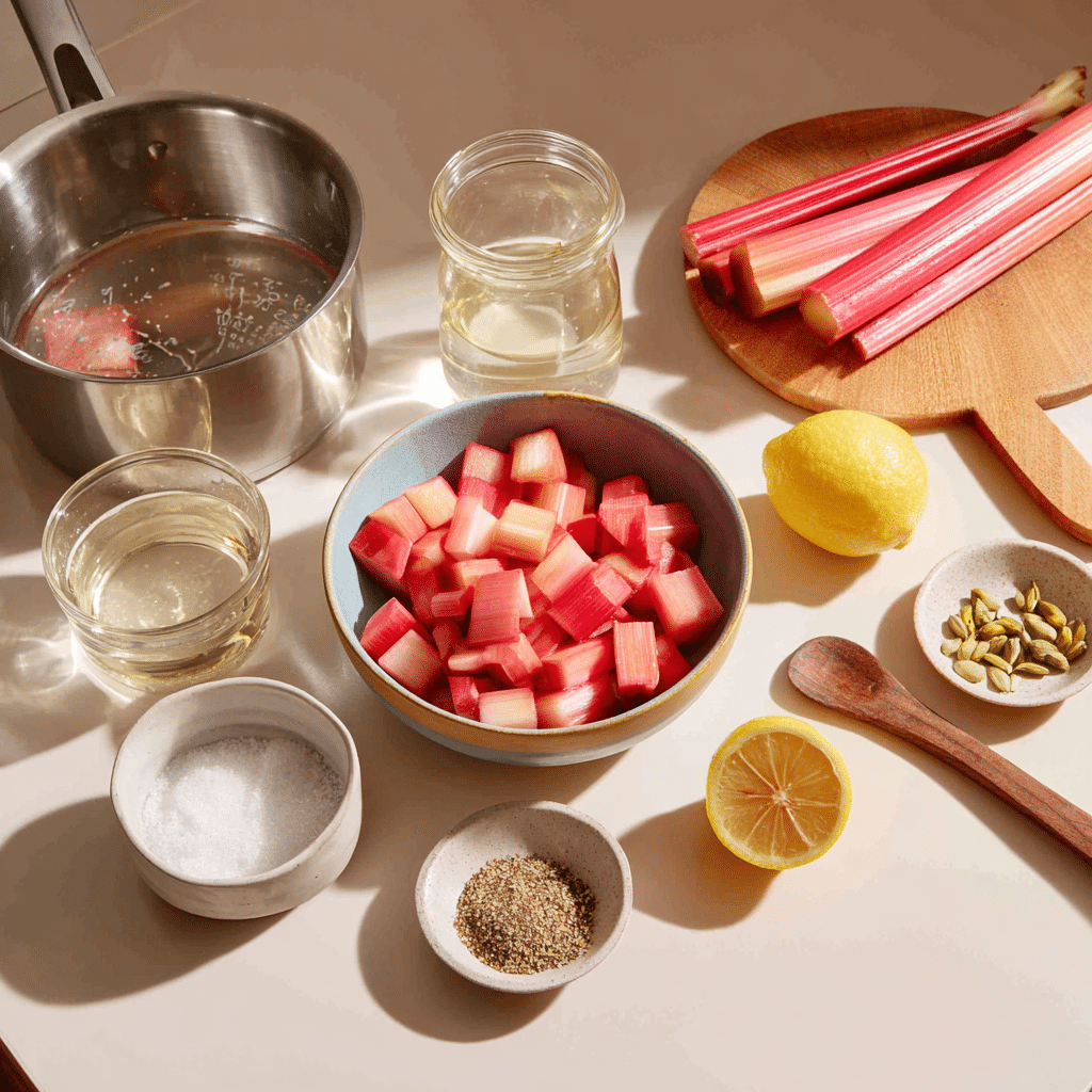 This Rhubarb Syrup uses a short list of ingredients to create a bold, balanced flavor. Here’s what you need and why each one matters: