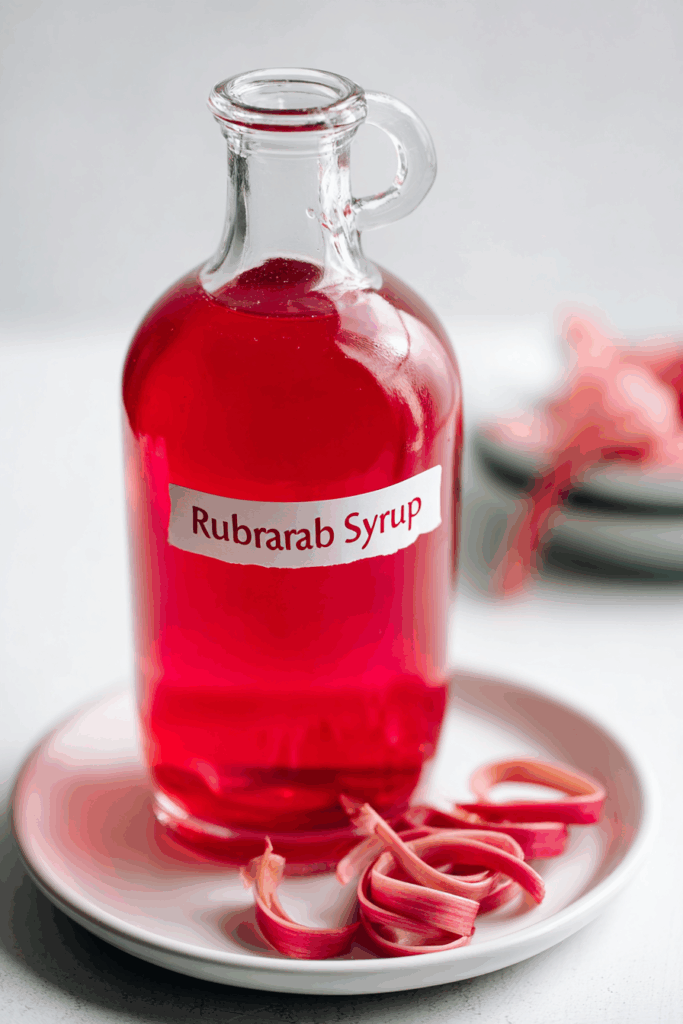 - Strawberry Rhubarb Syrup: Add ½ cup chopped strawberries during cooking for a sweeter, redder syrup; strain as directed (fridge life ~2 weeks).