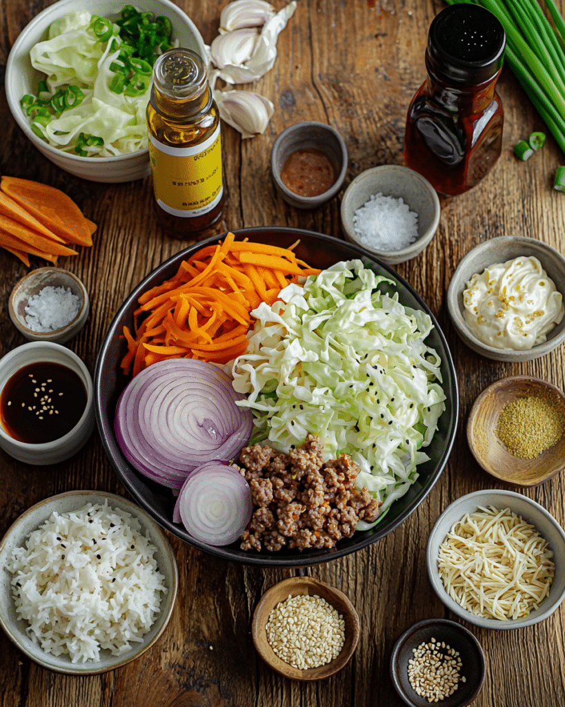 Soy sauce or tamari brings that classic salty umami richness that ties the dish to its egg roll roots.