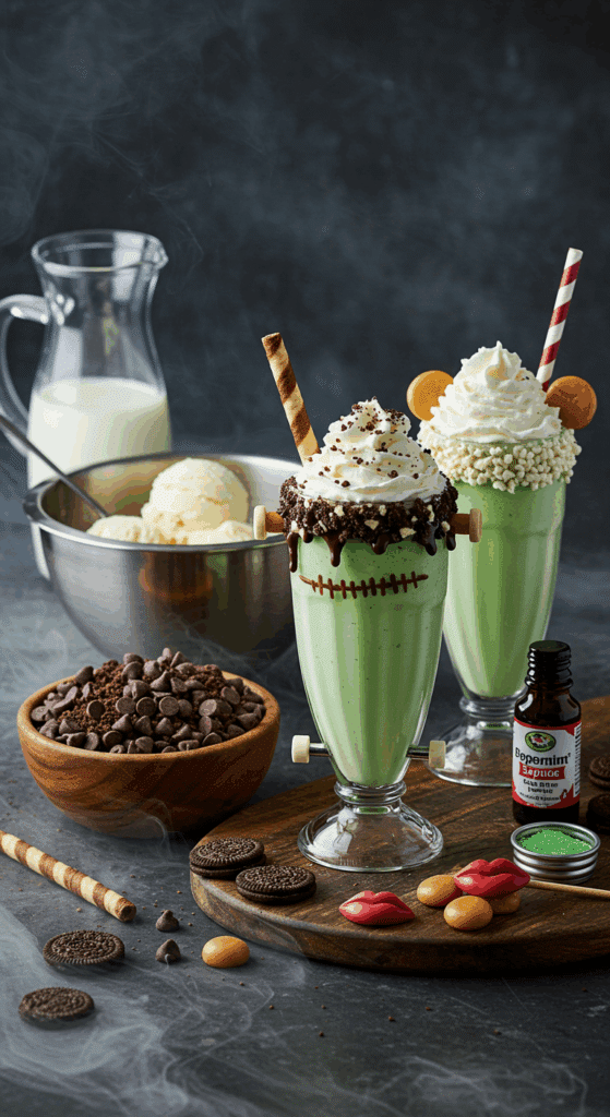 The ice cream and milk provide calcium and protein, making these shakes a slightly nutritious treat. The chocolate and candy decorations create a spooky, Frankenstein-inspired look, while the mint and vanilla flavors offer variety in one batch. The ingredients are affordable, widely available, and easy to swap for dietary needs, like gluten-free or vegan diets, making this recipe versatile for Halloween fun.